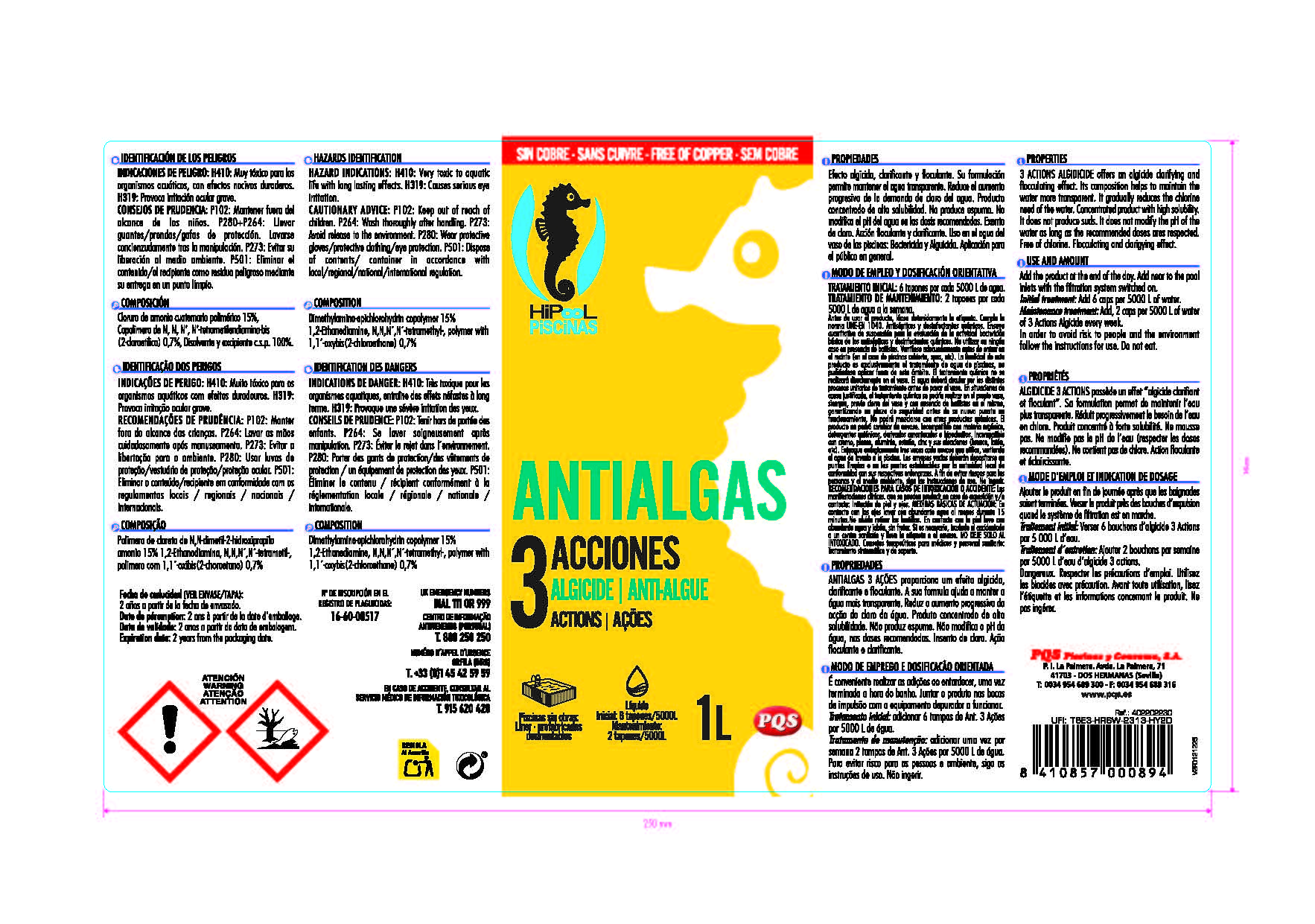 Efecto Algicida, Clarificante y Floculante. No modifica el pH del agua, en las dosis recomendadas. Exento de cloro. No deja residuos. No produce espuma. Alta solubilidad.