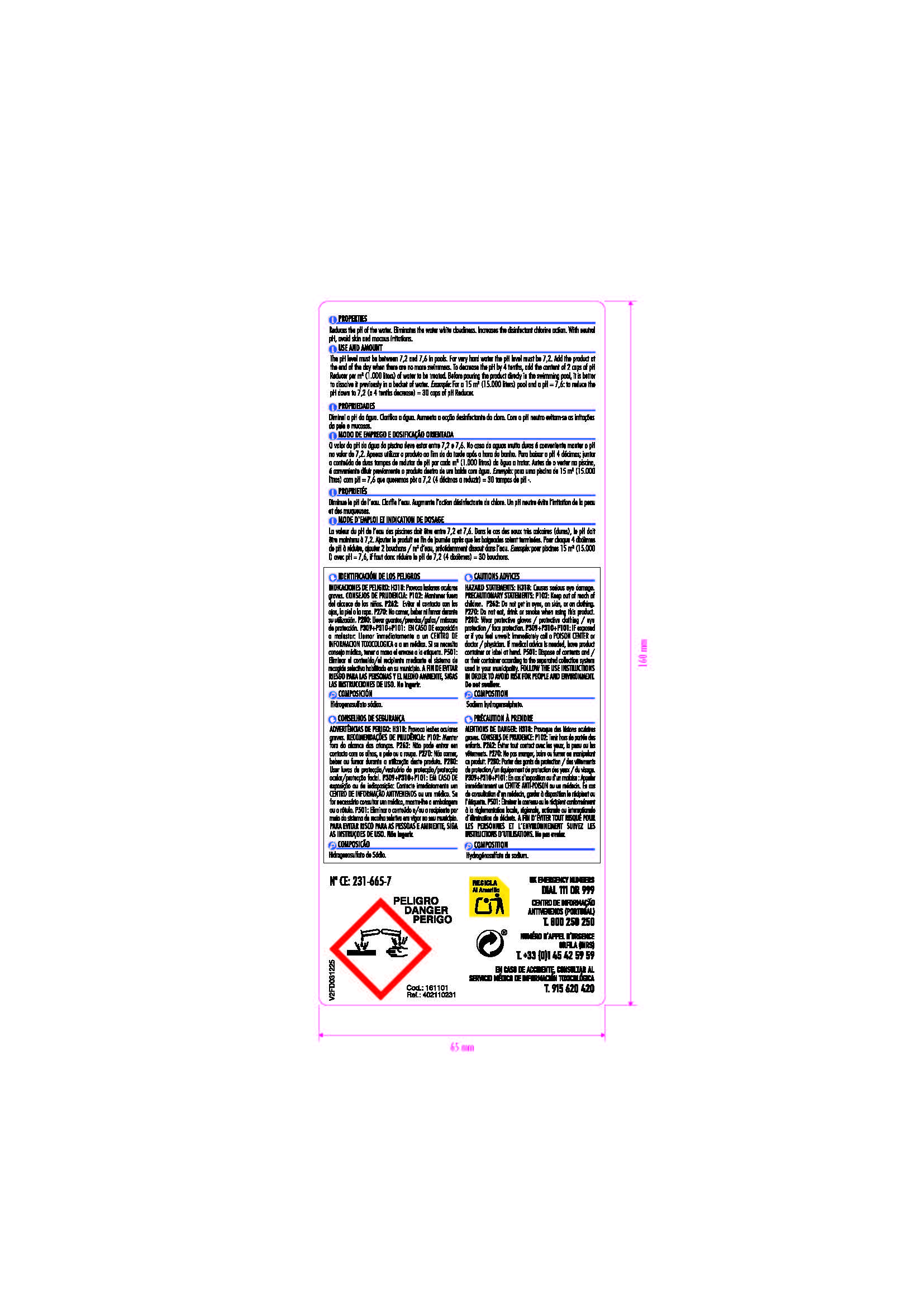 Dosis: para disminuir 4 décimas, añadir 2 tapones / m3 de agua.